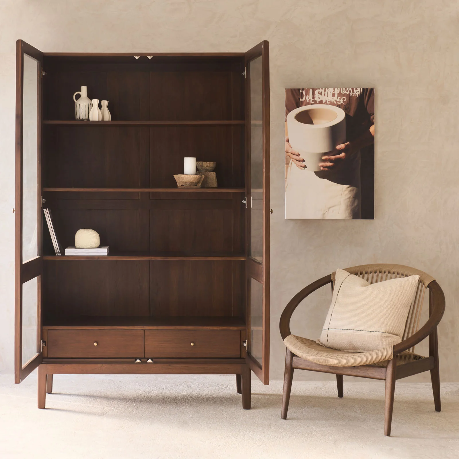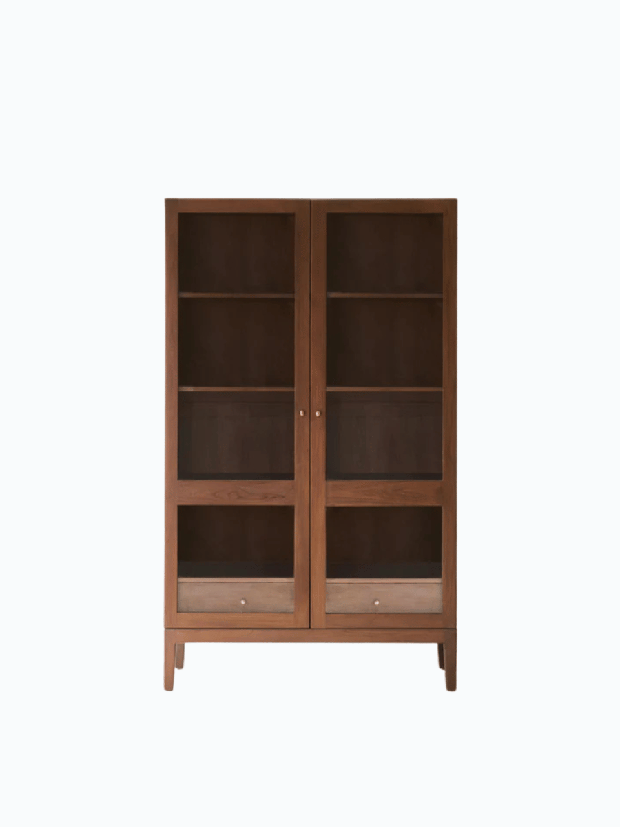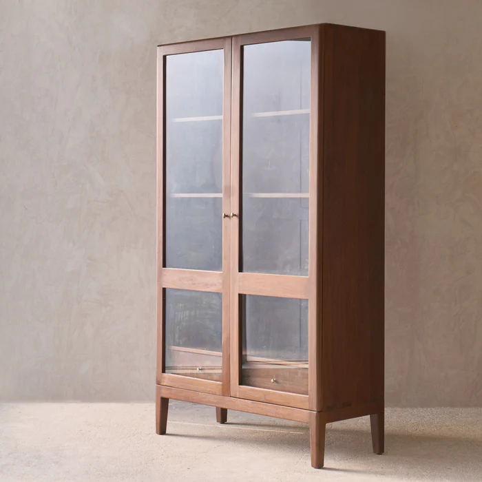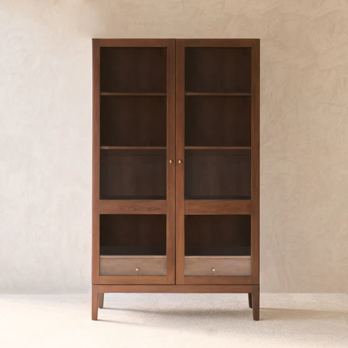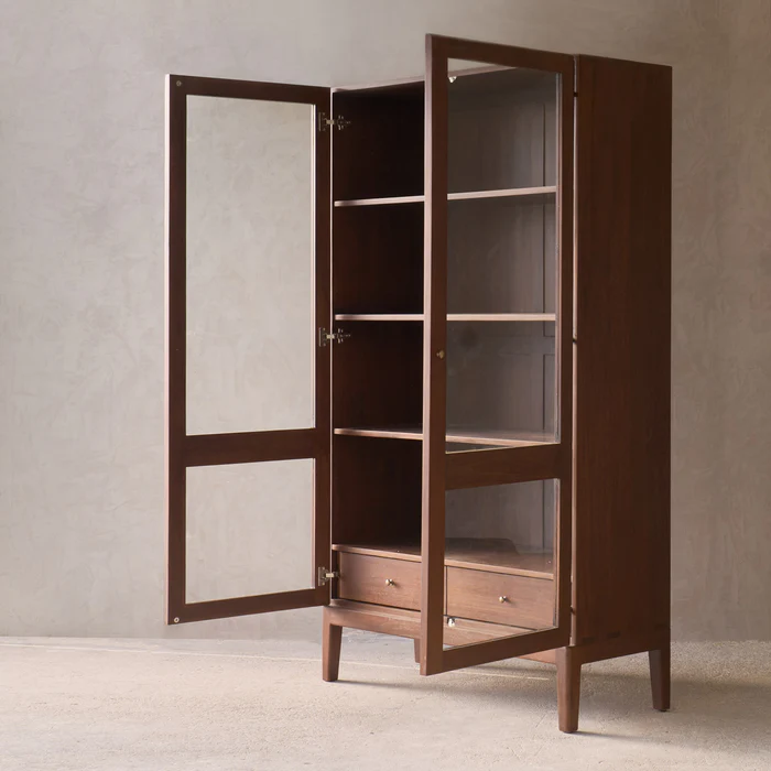 The Catalina Cabinet, a walnut storage cabinet, offers ample space for organizing tableware, linens, or personal items. Its walnut-stained finish adds warmth to interiors.