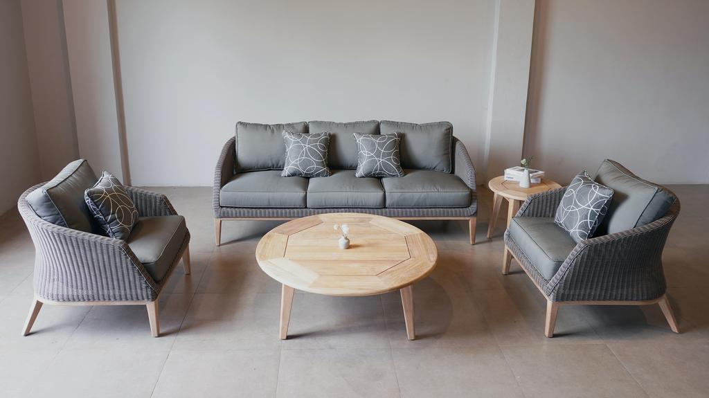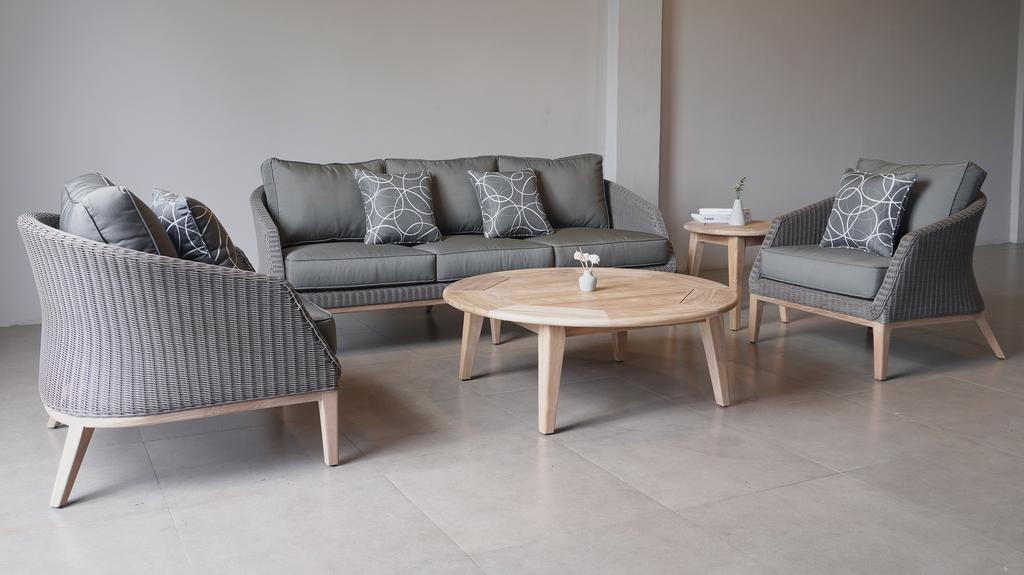 Grace Wooden 3 Seater Sofa combines solid teak durability with timeless style, offering spacious comfort for outdoor or indoor lounging.