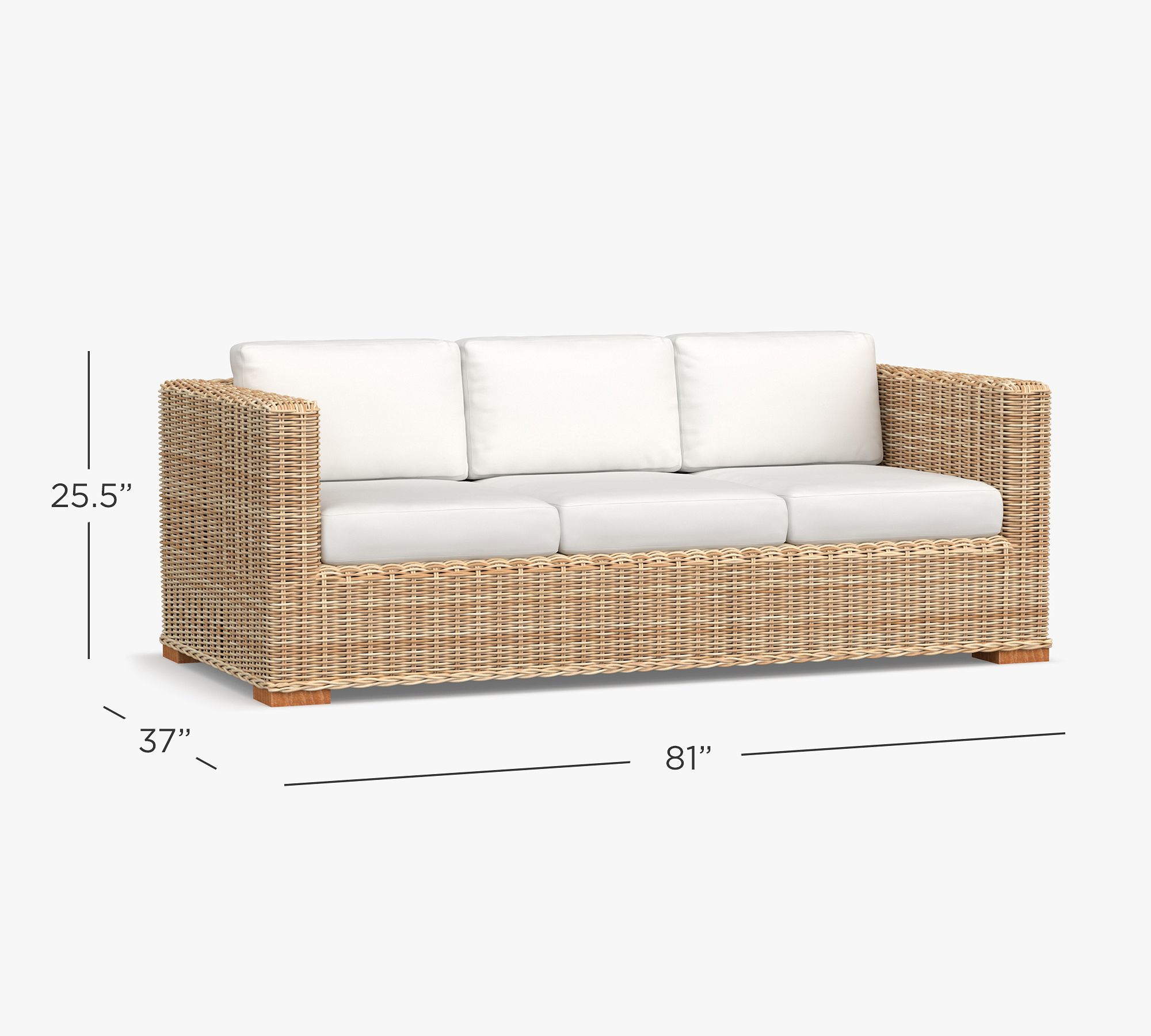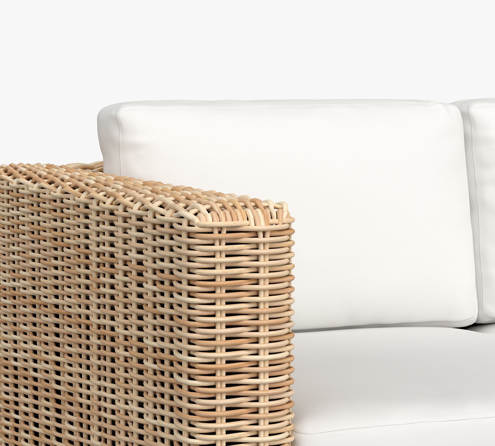 The Huntington Wicker Outdoor Sofa is crafted with handwoven resin wicker over a sturdy frame. Its square-arm design adds a modern edge to a classic coastal look.