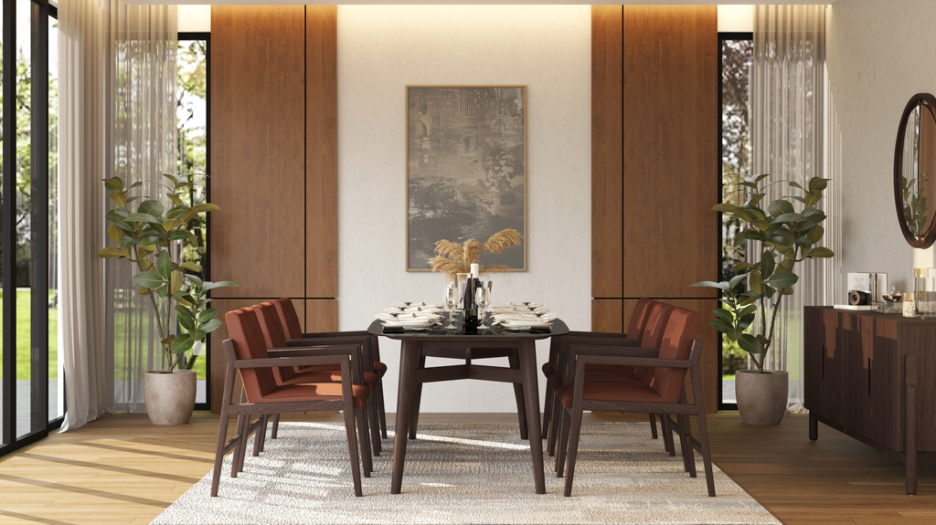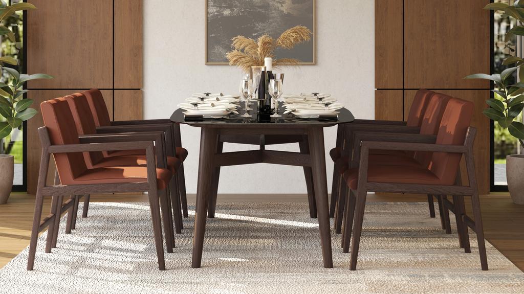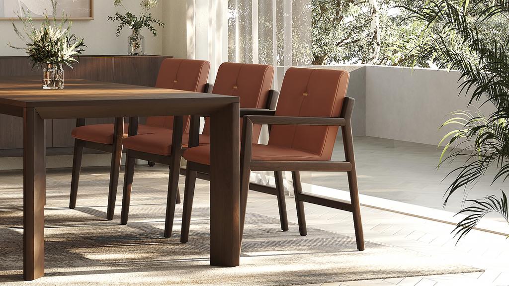 The Rhodes Leather Wooden Dining Chair, a leather wooden dining chair, combines the warmth of teak wood with the comfort of premium leather. Its padded seat and supportive backrest invite guests to linger longer.